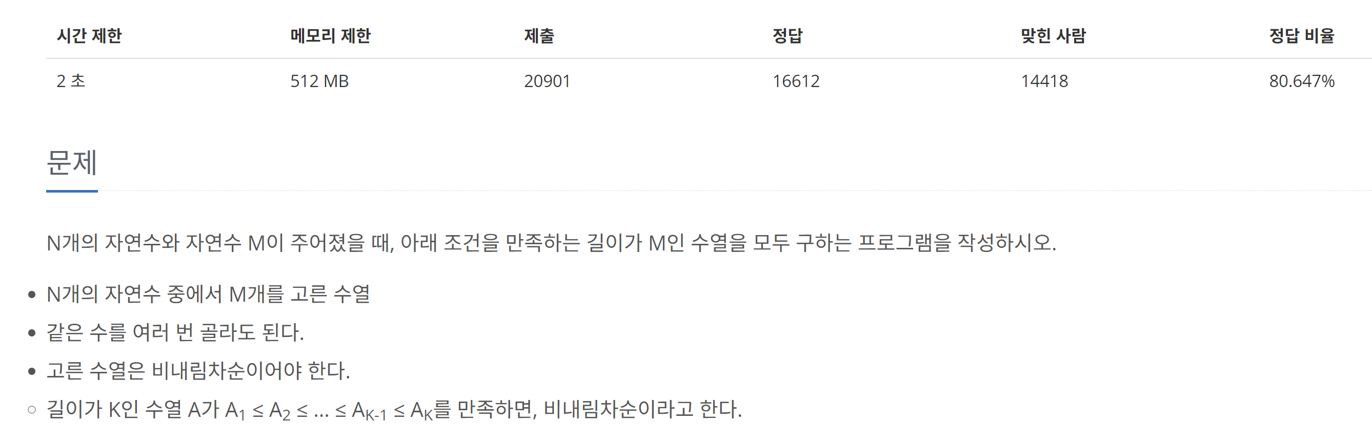 드디어 N과 M 문제들이 끝났다. 백트래킹 공포증 때문에 시작했던 건데, 이제 백트래킹의 틀 정도는 꽤 익숙해진 것 같다.