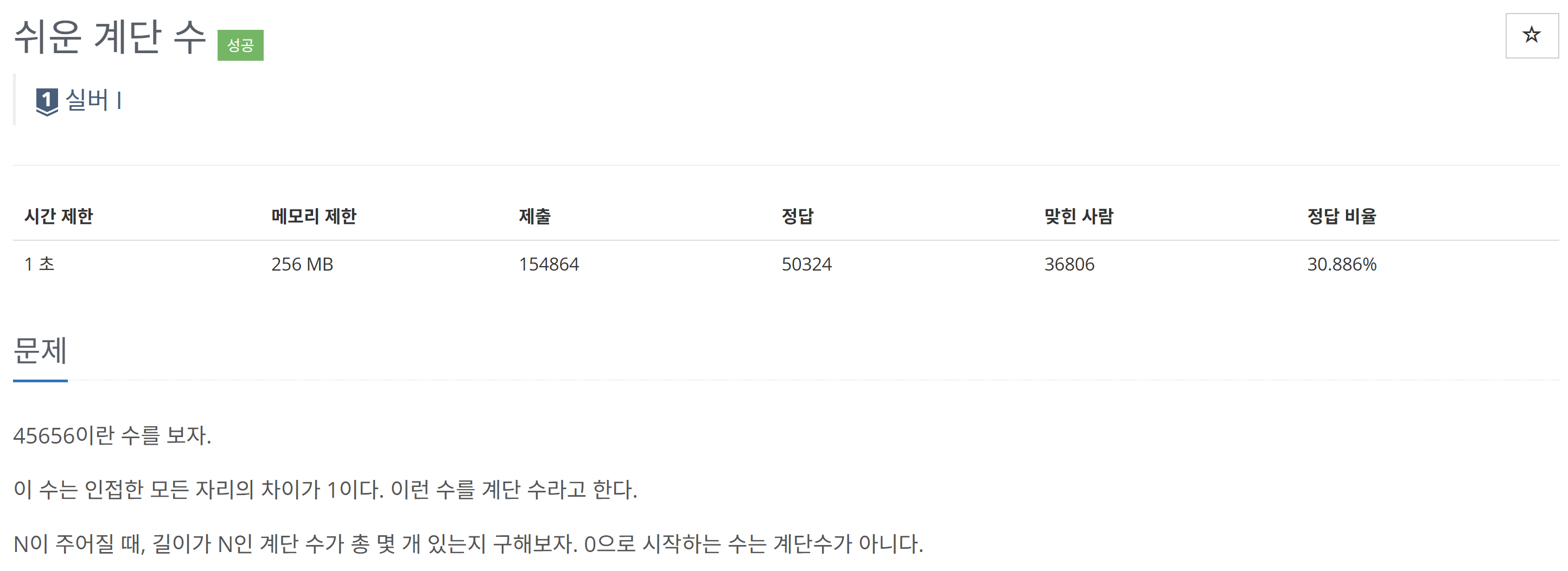 말 그대로 계단 수의 개수를 구하는 문제다. 점화식을 찾으면 쉽게 풀 수 있지만 그것을 찾는 게 매우 어렵다.
