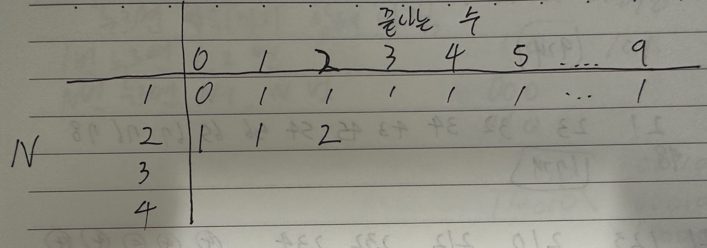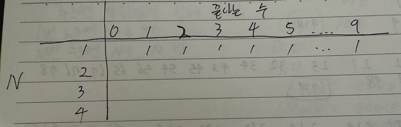 행은 자릿수(N), 열은 끝나는 수이다. 즉 N번째 자리에 해당 숫자가 들어간다는 뜻이다.