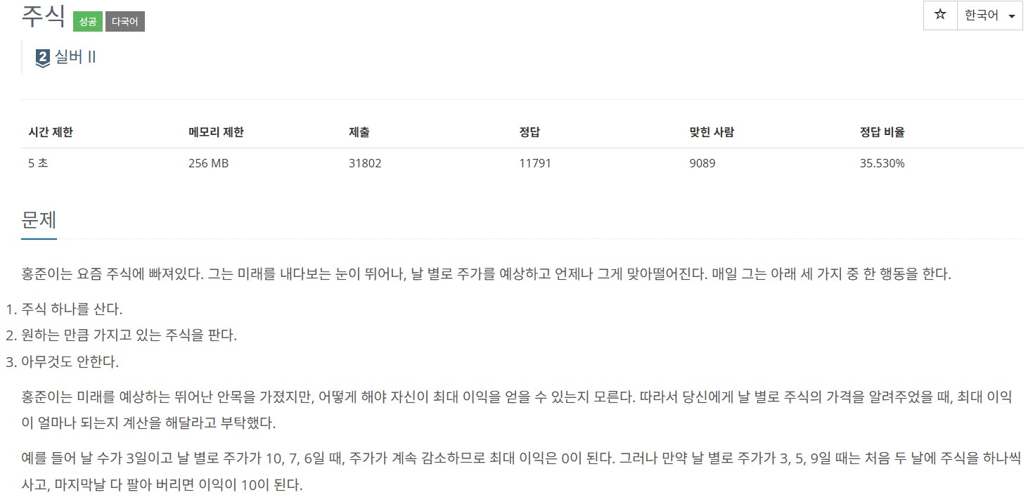 그리디 문제이다. 살짝 어려웠다. 난 2가지 방식으로 풀었는데, 의문점이 있다. import sysinput = sys.stdin.readline"""1. 큰 값 순서대로 정렬2. 현재 가장 큰 값 기준으로, 원본 리스트 역순 순회하며 가장 큰 값 찾기3. 찾았다면, 가장 큰 값 포함한 좌측 값 전부 사서 큰값에 팔기4. 원본리스트에서 방금 사용된 값을 전부 없애기5. 반복현재 가장 큰 값 idx가 while문당 1씩 증가하는데, 이거 좀 비효율이다. 이후에 올 큰값들이 지워지면 쓸모없어지기 때문따라서 가장 큰 값 리스트에서도 값들을 지워주고, 항상 0으로 인덱싱 하면 될 것 같은데 귀찮다.[1, 3, 1, 10, 2, 9, 3, 10, 5][10, 9, 5, 3, 2, 1]"""for _ in rang..