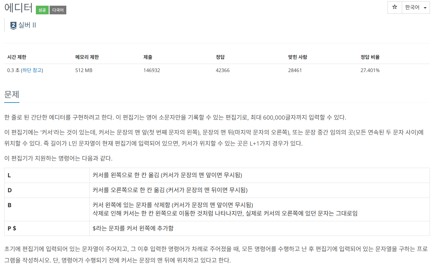 문제 자체는 시뮬레이션인데, 시뮬레이션 그대로 구현하면 무조건 시간 초과가 난다. 시간제한이 0.3초고, 삽입/삭제를 직접 수행할 경우 명령어가 50만개라서 50만 * 10만 하면 500억번 연산이라 자료구조를 잘 활용해야 한다.나는 ArrayDeque 2개를 활용했다. import java.io.*;import java.util.*;public class 에디터_1406_v2 { static ArrayDeque left = new ArrayDeque(); static ArrayDeque right = new ArrayDeque(); public static void main(String[] args) throws Exception { BufferedReader br = new BufferedRead..