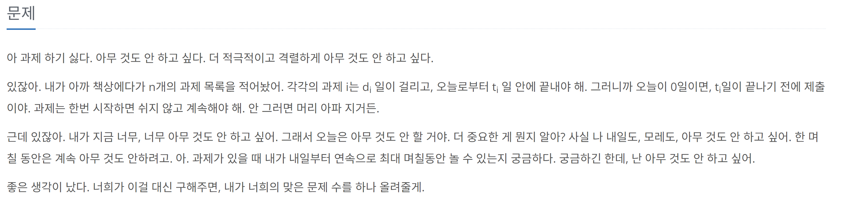 N은 과제의 개수D는 과제 소요일, T는 과제 마감일이며 D, T 형태로 주어진다. 최대한 과제를 미루고 미루다가 마지막에 한번에 몰아서 하는데, 이 때 첫 과제를 시작하기 전 최대 며칠을 놀 수 있는지를 구하는 문제이다. 먼저 과제 마감일 기준으로 내림차순 정렬을 해줘야 한다. 그리고 day 변수에 가장 긴 마감일을 설정해 둔다. day는 놀 수 있는 날을 저장해둘 변수이며, 반복문이 진행되며 계속해서 갱신된다. 그리고 N번 반복문을 돌리되, day와 e(현재 과제의 마감일)중 더 작은 값에서 s(현재 과제의 소요일)을 뺀다.그 뺀 값을 다시 day에 할당한다. day가 길어도 과제의 마감일이 더 이르다면 마감일에서 s를 빼고,마감일이 길어도 현재 남은 day가 더 짧다면 day에서 s를 뺀다.이걸 반..
